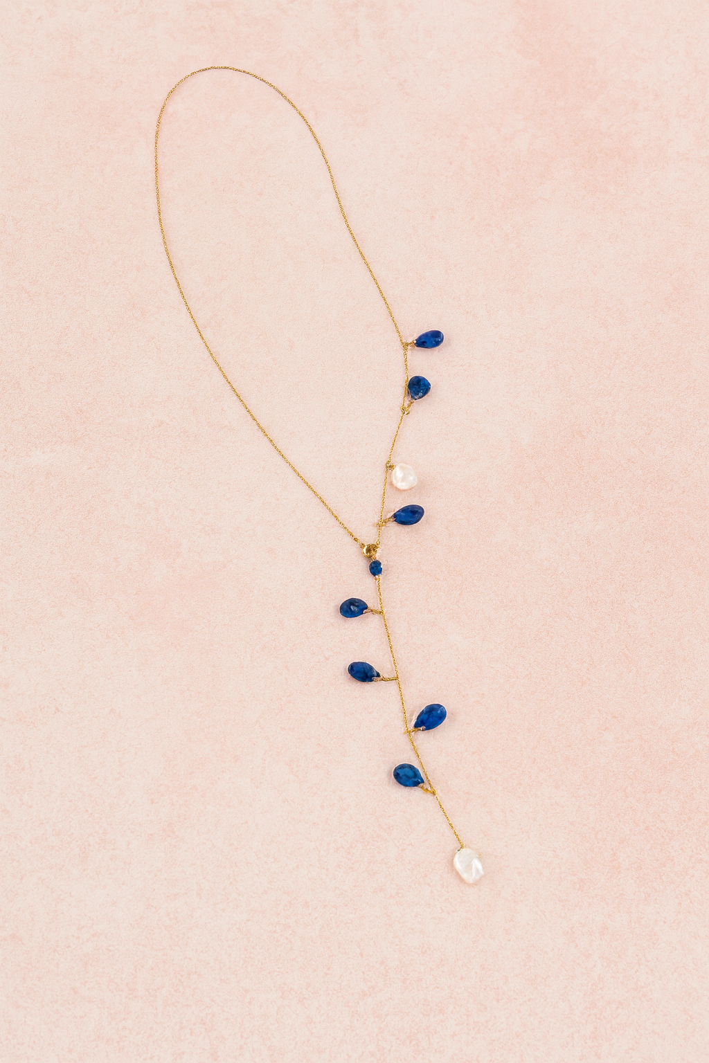 Introducing Azure Bloom, a handcrafted statement piece from the Seraphine Collection. Designed for the woman who dares to be different, this necklace brings together natural blue sapphire stones with a curated mix of baroque and semi-baroque freshwater pearls.