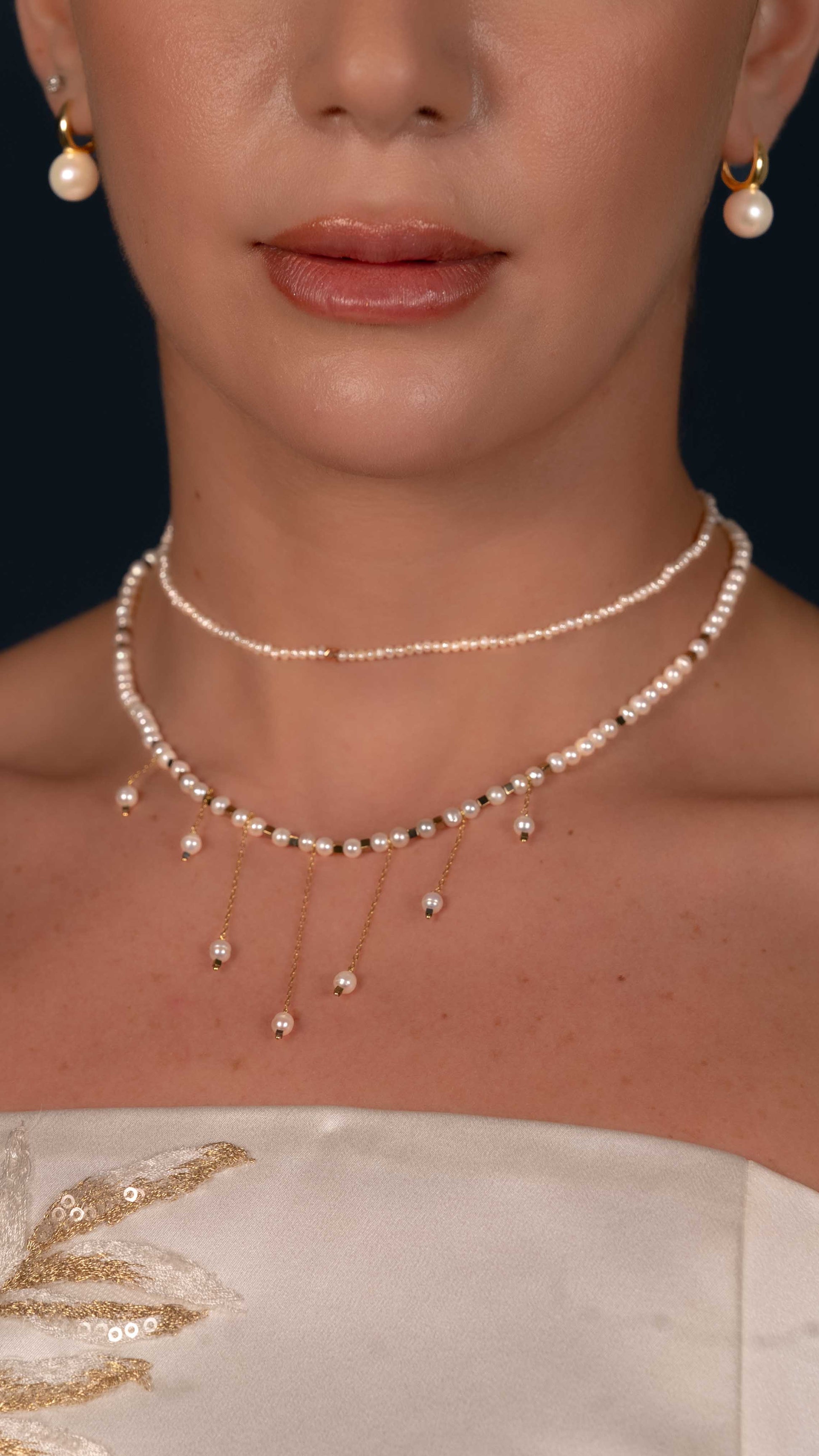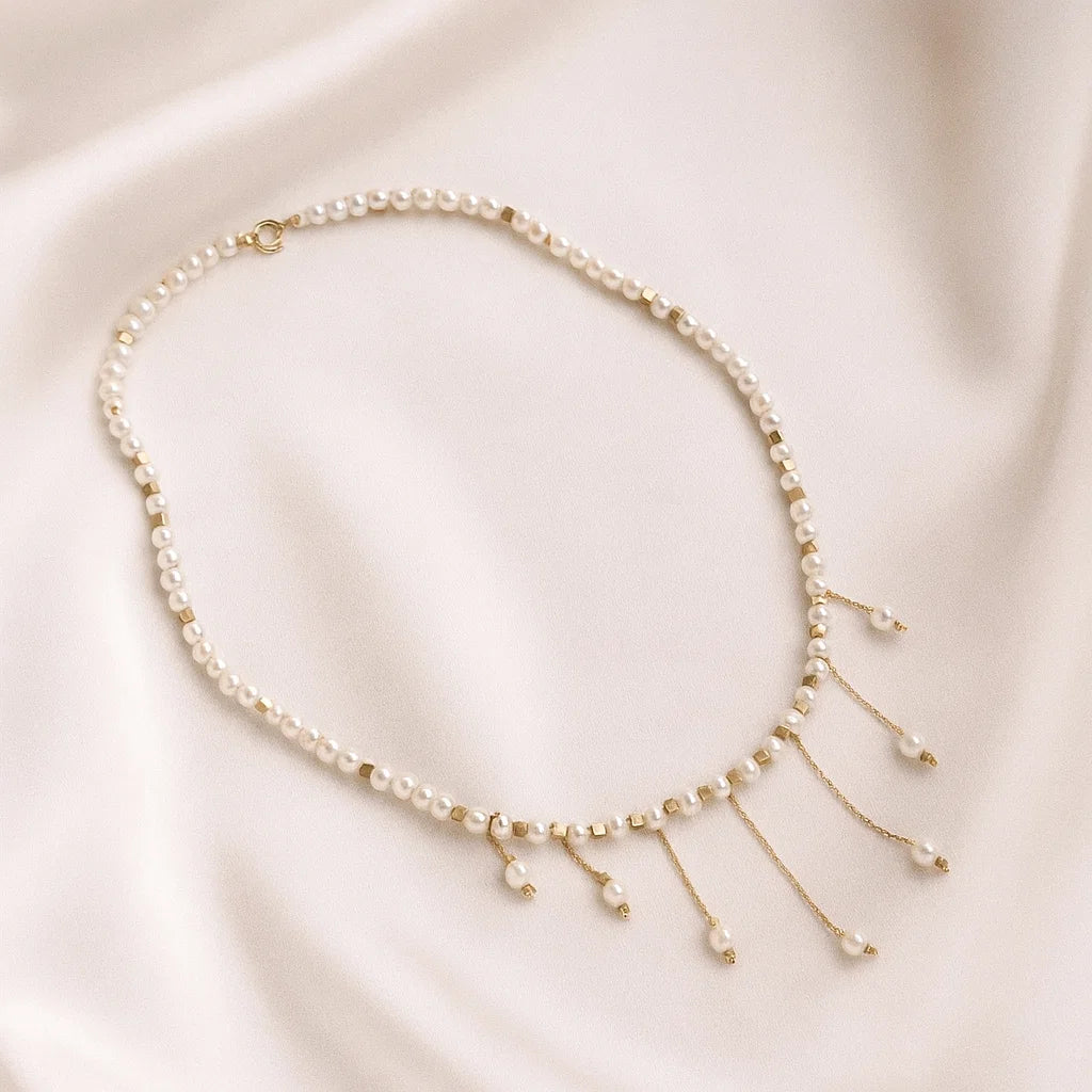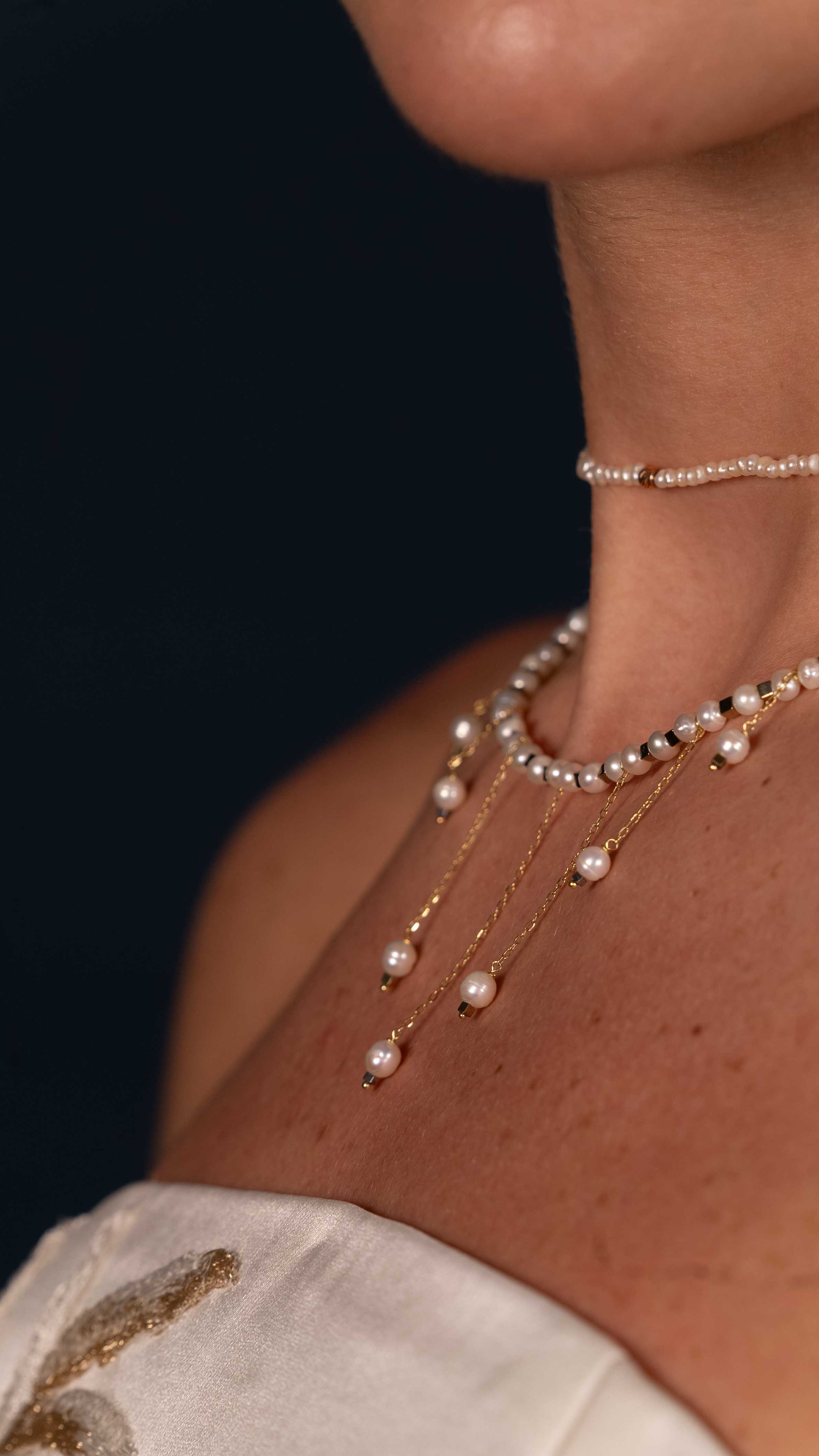 Alive with rhythm and radiant with detail, Cascade is a handcrafted necklace that turns movement into art. Featuring a carefully arranged mix of luminous freshwater pearls and delicate 18K gold chains, this piece flows like sunlight over water.
