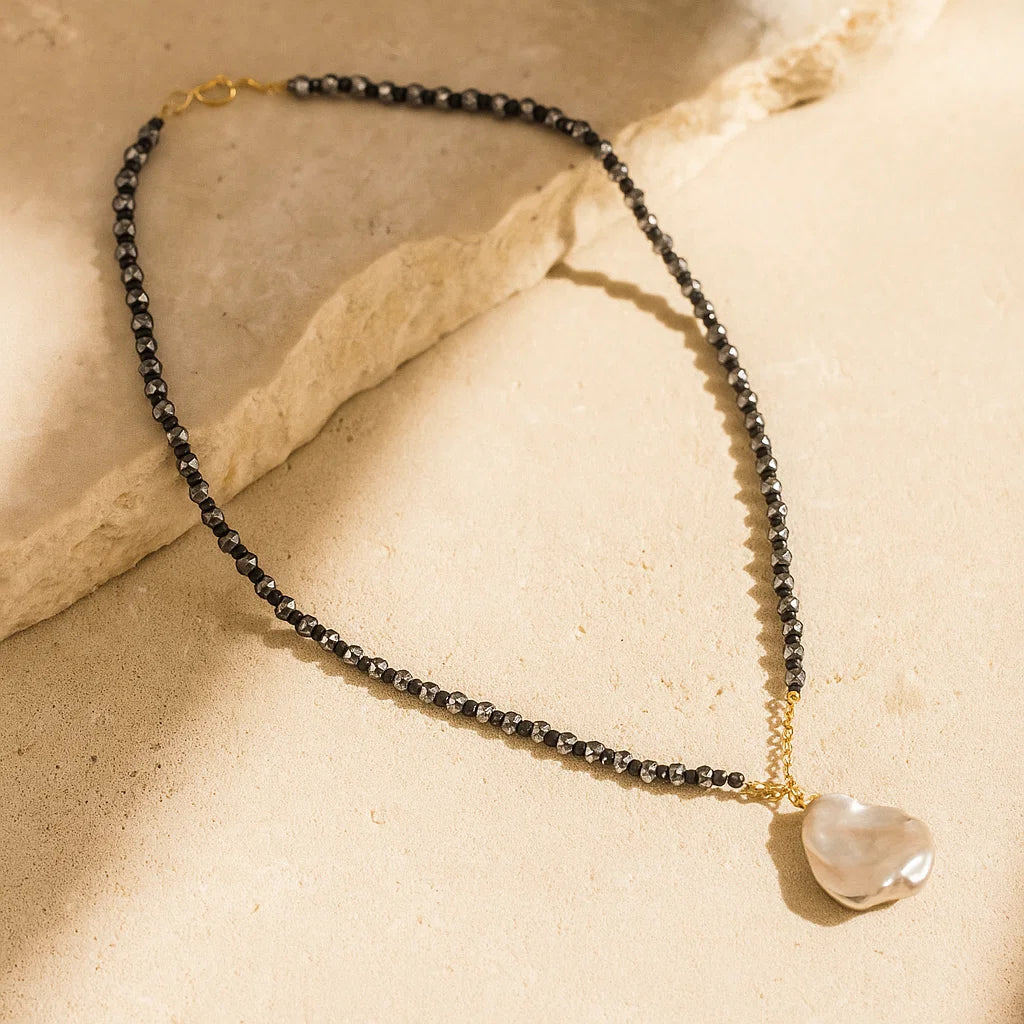 Bold, untamed, and unforgettable — Dark Tide is a handcrafted necklace made for the fearless. Featuring a luminous semi-baroque freshwater pearl suspended from an 18K gold link, it’s strung with deep-toned hematite beads that reflect light like the ocean at dusk.