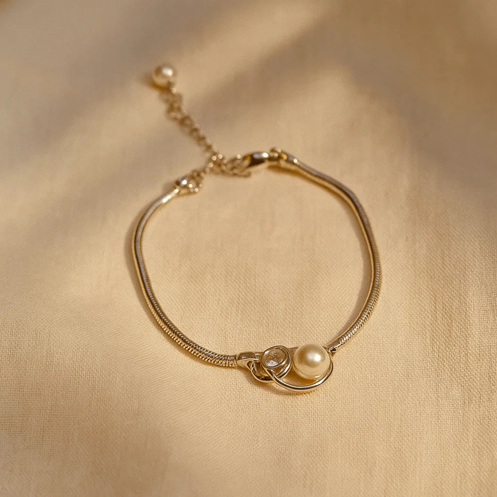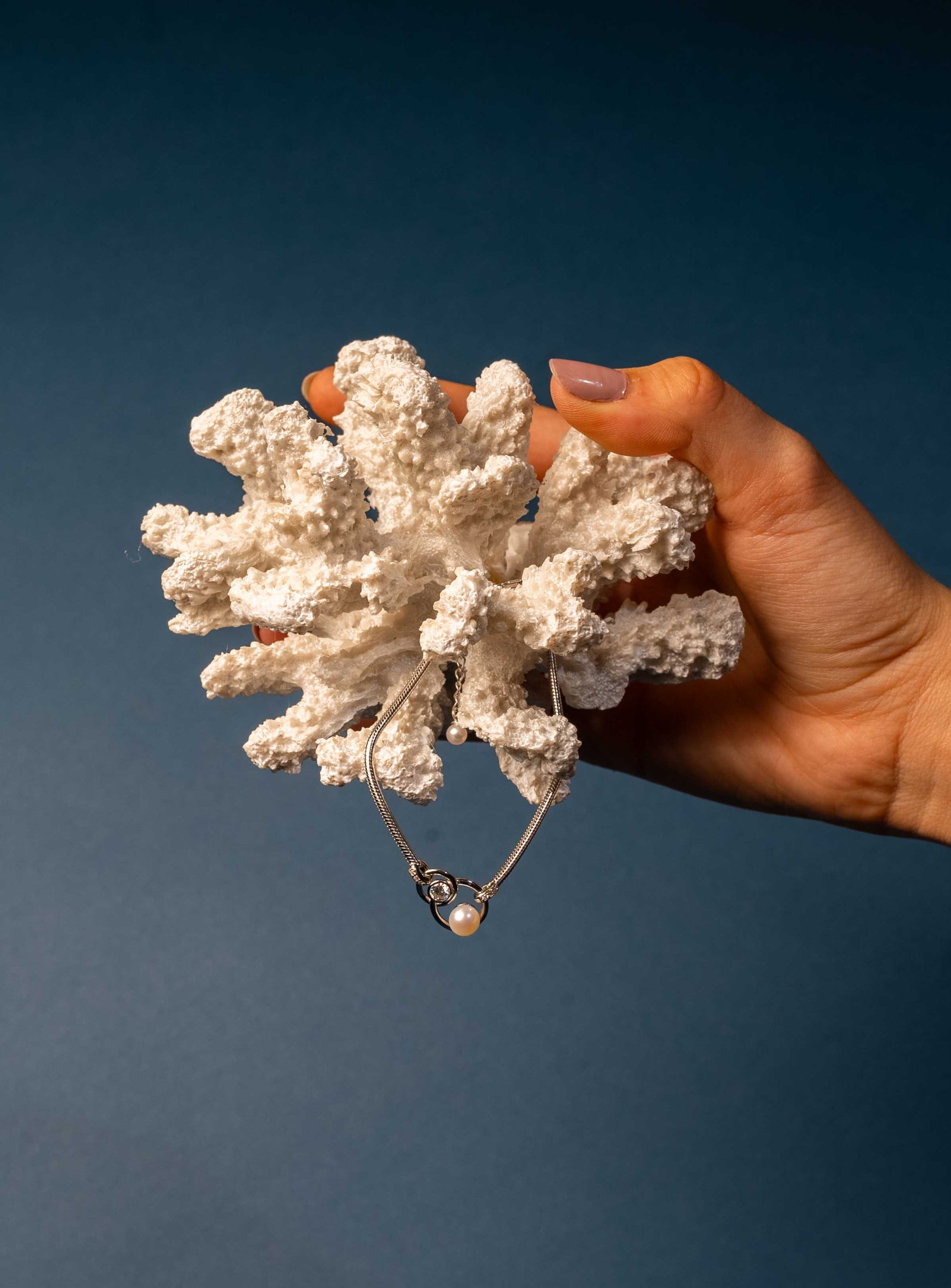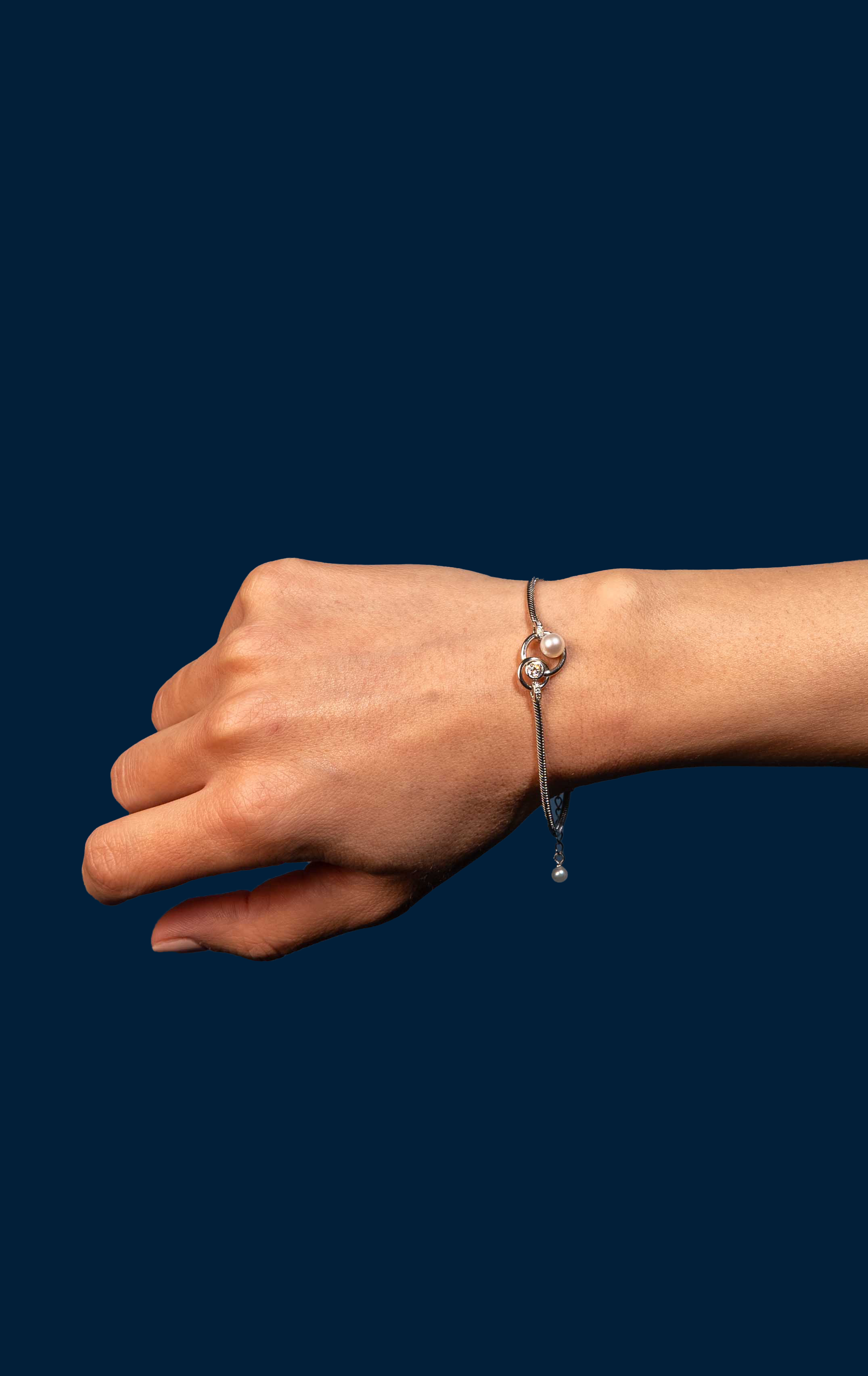 Eclipta is a quiet tribute to balance and beauty. At first glance, it’s simple — but every detail speaks. A smooth sterling silver snake chain flows elegantly around the wrist, ending with a delicate drop pearl.