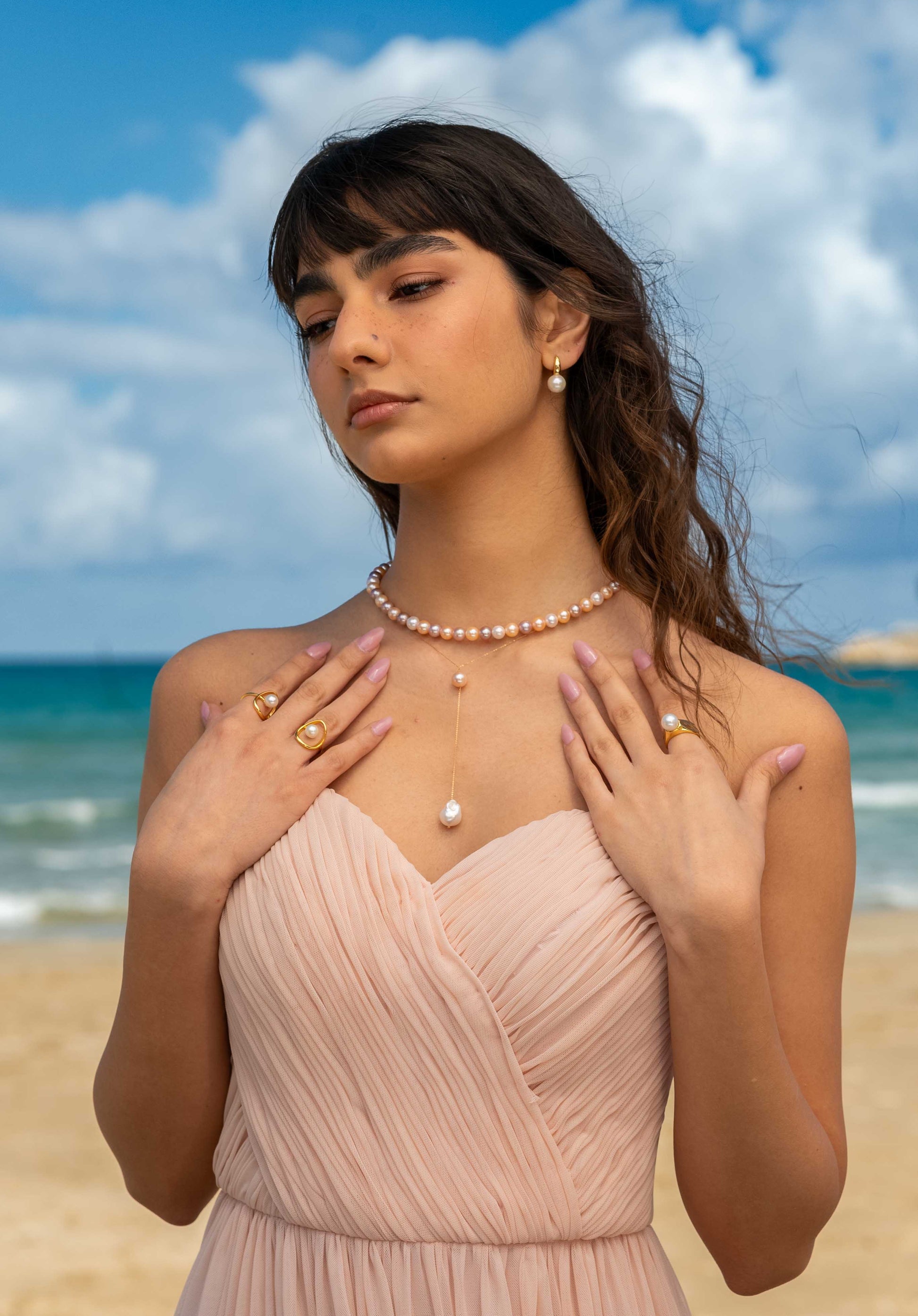 | Pearls | Pink freshwater pearl + drop baroque pearl |