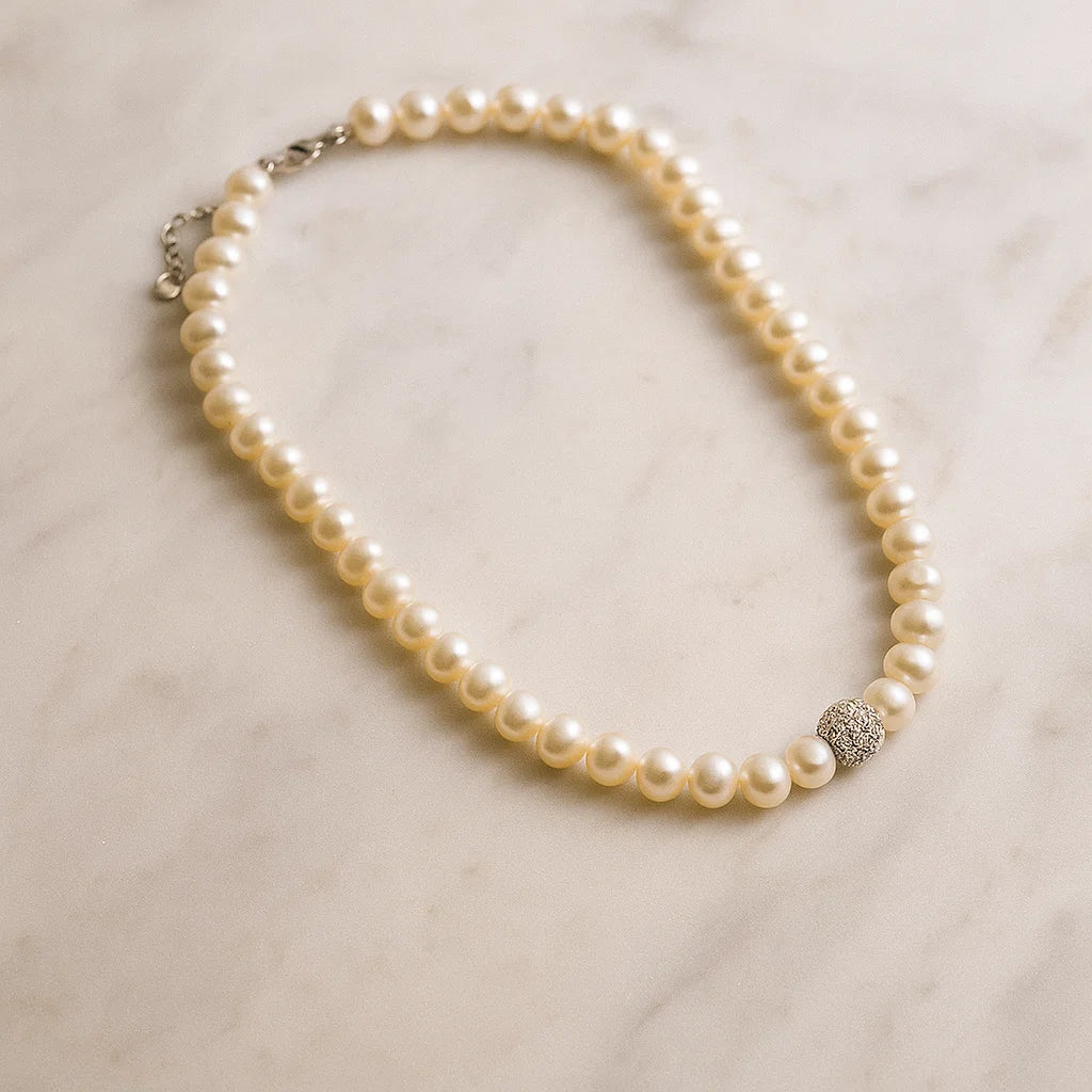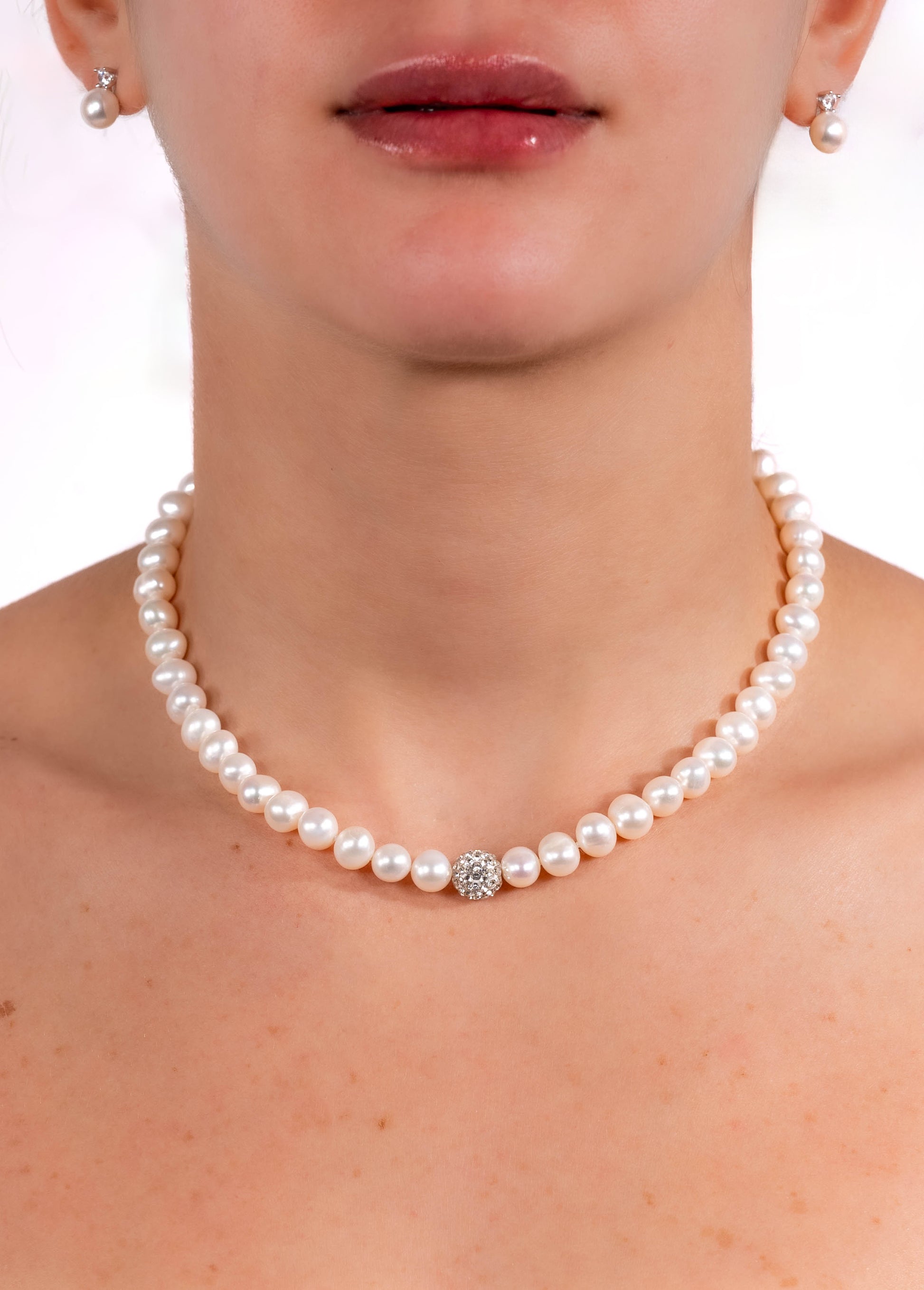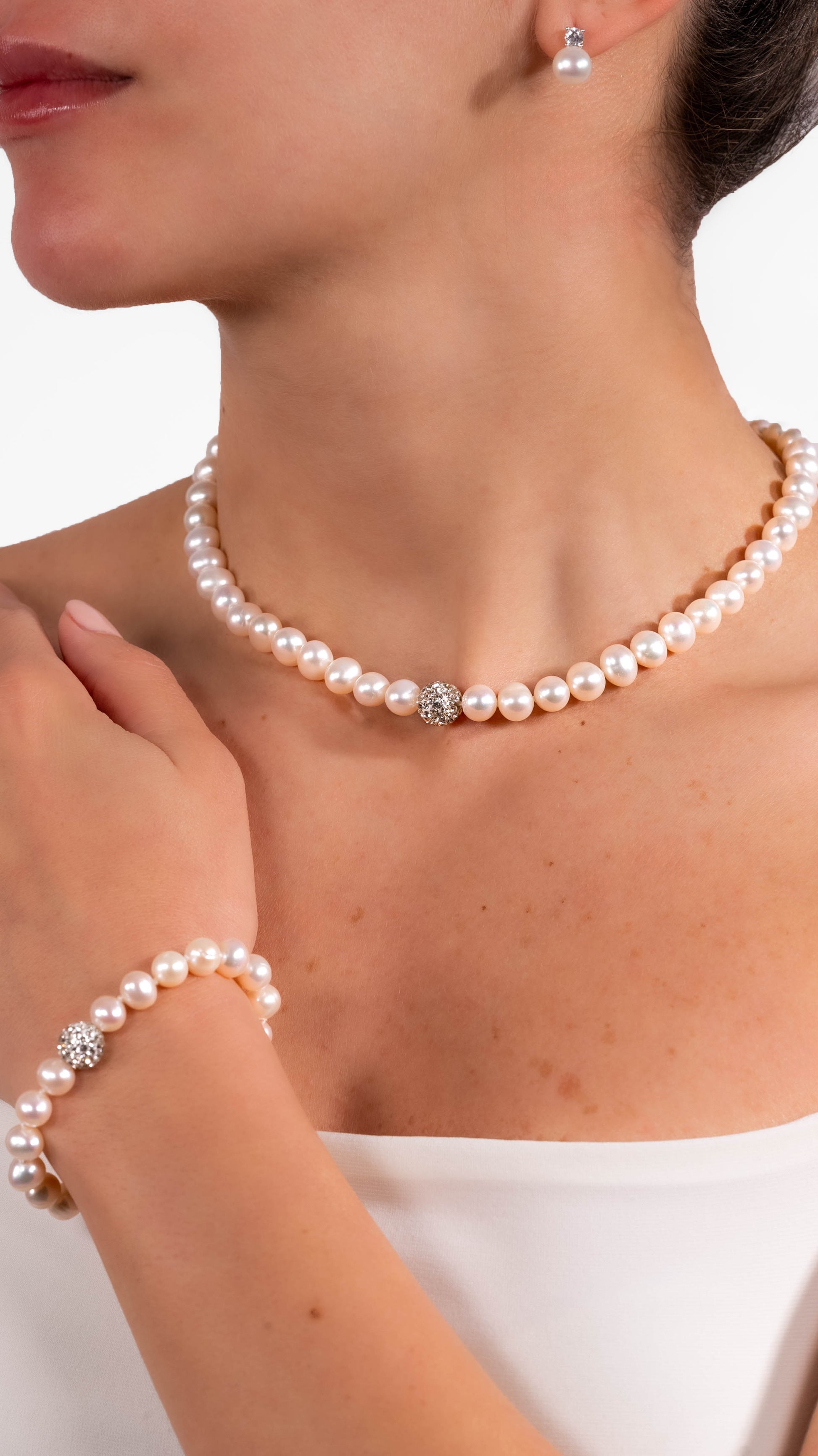 | Set Includes | - Pearl strand necklace with silver moissanite pavé ball - Matching pearl bracelet |